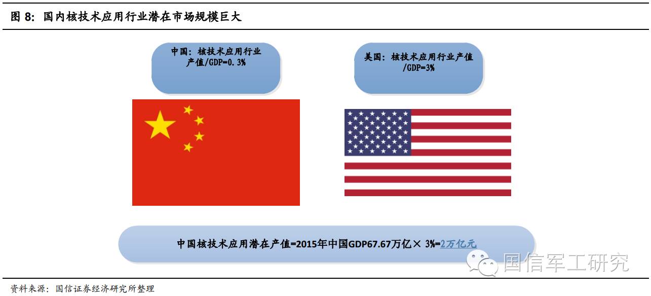 十三五规划提出把核技术纳入前瞻布局的战略性新兴产业,提出核技术应用并作阐述尚属我国五年规划的首次。核技术应用也称非动力核技术应用,是利用同位素和电离辐射与物质相互作用所产生的物理、化学及生物效应,来进行应用研究与开发的技术,被称为“核工业的轻工业”。美国核技术应用行业产值占GDP的比例为3%,而我国这一数字为0.3%,我国核技术应用行业的潜在市场规模达万亿级别。