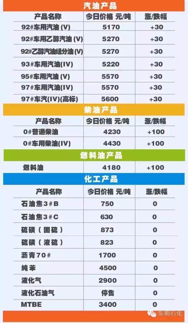 菏泽东明石化汽油涨30柴油涨100:国四93#5220,国四97#5570(密度0.73),国四97#高标5600(密度0.73),国五92#5170,国五E92#5270,国五95#5540,0#普柴4230(密度0.84),-10#普柴4230(密度0.84),国四0#车柴4430,国四-10#车柴高标4430(密度0.835),国五-10#4530(密度0.84)。