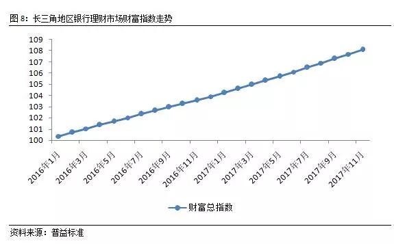长三角地区银行理财财富稳定累积。由于银行理财通常以预期收益的形式发行,因此收益与时间呈现正相关关系。由图可见,长三角地区银行理财市场财富指数随时间推移持续上行,仅有单月增幅差异的变化。2017年11月,长三角地区财富指数继续上升,环比上涨0.41点至108.10点,长三角地区财富稳定累积。