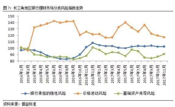 价格波动风险与基础资产传导风险走势相悖,总风险小幅上升。从风险指数看,11月长三角地区银行理财市场风险指数有所上升,环比上涨0.66点至101.79点,这是近5个月以来长三角地区银行理财市场风险的首次上扬。具体来看,由银行承担的隐性风险继续在低位震荡,环比下降0.28点至102.30点;价格波动风险继续下滑,环比下降2.09点至117.45点;基础资产传导风险涨幅较上月有所扩大,环比上涨4.57点至91.15点。基础资产传导风险的上涨带动整体风险上行。