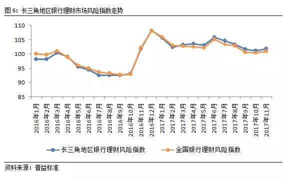 从风险指数来看,本月长三角地区银行理财风险指数环比上涨0.66点至101.79点,这是近5个月以来,长三角地区银行理财风险首次出现上扬。11月中旬发布的资管新规(征求意见稿)给市场带来了较大冲击,地区银行理财市场有一定波动,促使银行理财风险有所上升。随着市场对新规的消化,,预期12月整体风险不会出现大幅上扬。