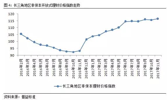 长三角地区非保本开放式理财价格指数转跌为升。经过上月的下跌,本月长三角地区非保本开放式理财价格指数有所上涨。从指数走势来看,在今年前三季度各季度末月,该类指数有相对明显的上升情况,呈现一定的周期性。趋近年末,资金面将季节性收紧,预计长三角地区非保本开放式理财价格指数将继续上涨。