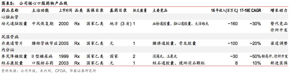 贴膏剂16年实现收入10亿元,预计17-19E收入CAGR在22%,得益于1)旗舰单品通络祛痛膏(16年收入约5亿元)双渠道稳健放量;2)舒腹贴膏等高毛利品种计划明年进入诊所;3)壮骨膏等普药稳健放量;4)的医保范围调整与进口替代。口服药16年实现收入3.3亿元,预计17-19E收入CAGR在39%,得益于1)培元通脑胶囊与参芪降糖胶囊的诊所覆盖;2)结石康胶囊新进医保;3)丹鹿通督片通过渠道转换(医院+OTC转向全OTC再转向OTC+诊所)18年有望迎来恢复性增长。