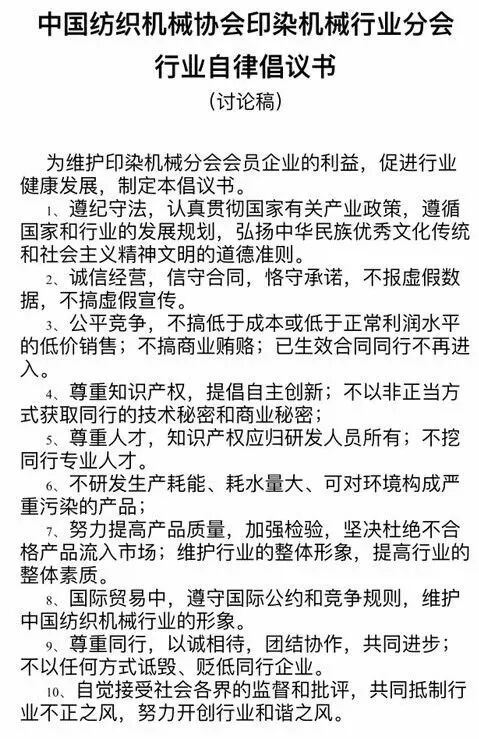 为维护印染机械分会会员企业的利益,促进行业健康发展,分会向全体会员发出了《行业自律倡议书》。