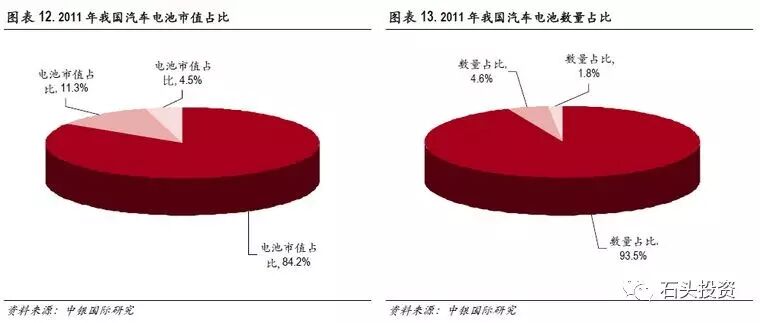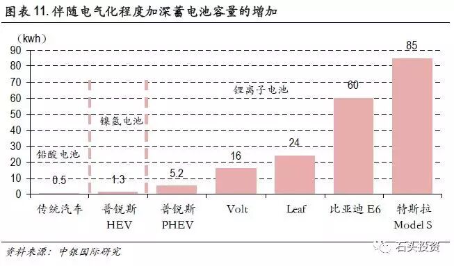 在新能源汽车中,电池组容量与其在整车成本中的占比呈正相关。例如,日产Leaf 中的电池容量为24kwh,电池成本占整车总成本为30%左右。而Tesla 的Model S汽车,由于电池容量高达85kwh,电池成本在整车成本中占比高达55%。目前,铅酸电池还是汽车电池中最主要的电池类型,新能源汽车的推广和发展将大幅度提振汽车动力电池的需求,特别是未来将拉动锂离子电池的需求。