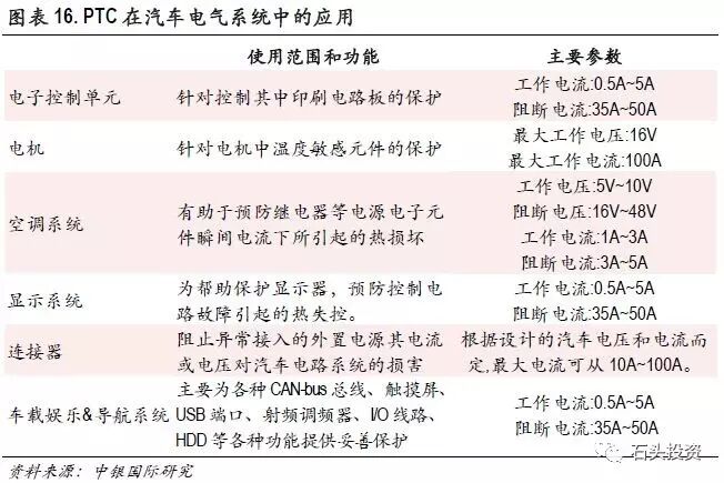 车电气系统中使用的PTC 主要是在过压或过流的情况下,起到保护电路板、执行器等的功能。相对于熔断丝而言,PTC 阻断相应时间更快,响应时间是熔断丝的1/5~1/10,且具有可恢复性,可反复多次使用,从而为客户免去了更换熔断丝的麻烦。