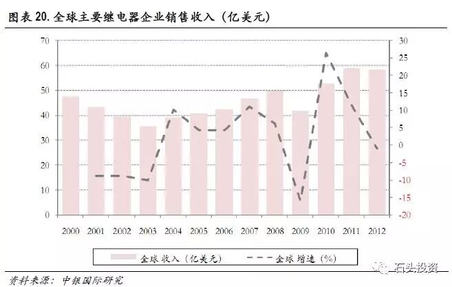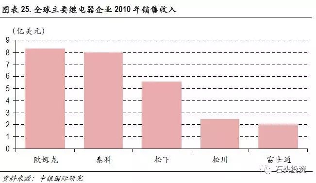 2012 年全球汽车销量大约为6,000 万辆,以每辆汽车继电器价值为30~40 元美元测算,全球汽车继电器市场容量大约为20~25 亿美元。与此同时,由于高压继电器的应用,预计未来每销售100 万辆新能源汽车,将新增4~5 亿美元的汽车继电器市场容量。