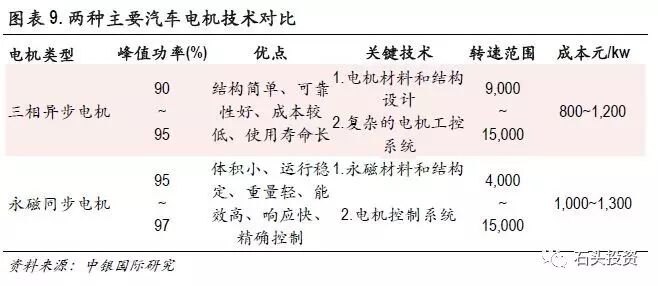 而在新能源汽车领域,电机将深度直接参与到汽车的驱动过程,需要扮演主要驱动机和发电机的角色。从技术发展趋势来看,目前汽车高效电机以永磁同步电机和三相异步电机两种为主。其中,永磁同步电机由于单位体积输出功率密度高,主要用于对空间要求比较高的小型汽车,而三相异步电机常见于大型客车中。