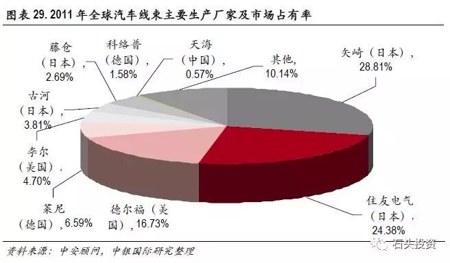 在零配件中,汽车线束负责将汽车中的各个电气部件连接起来,所以在产品性能上,关注的重点是线束的电压降和电磁兼容性。由于汽车线束是影响整车电气性能的关键性零配件,所以世界上各大生产商与专业的线束生产商通常保持了长久而密切的稳定合作关系。全球汽车线束厂家高度垄断,主要的四家生产商占有了超过75%的市场。其中大多数日本的汽车线缆生产商原本从事于电线线缆的生产,有很好的产品技术传承,同时,像住友等公司还掌握上游的矿业资源,成本控制力比较好。