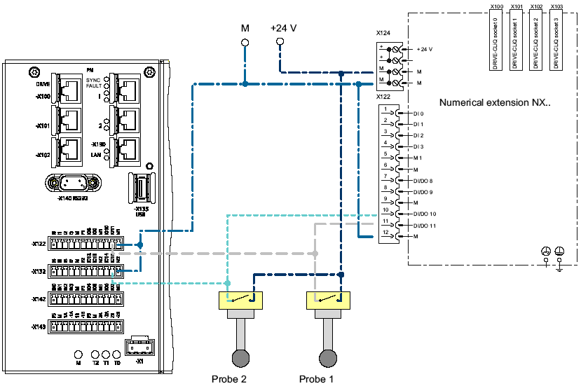 本文西门子系统,以828D为例,测头接线如图3所示,图中包含了有扩展NX模块时的连接情况。