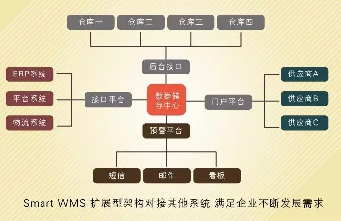 Smart WMS智慧仓库管理系统专业版拥有极具灵活性的扩展型系统架构,并通过企业系统接口,支持与企业其他自有管理系统与其他外部的系统进行批量的和直接的数据交换处理。预留了企业其他自由管理系统接口,如企业ERP系统、财务数据系统,无缝衔接,利于扩展,支持数据的导入,和数据信息的交换。