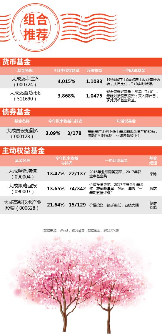 建军节行情,重视二线蓝筹、中盘蓝筹、创蓝筹相对收益。建军节行情如期演绎、龙马行情风格继续、周期消费五波交替表现,投资者应以清净之心对抗躁动之心,以无为投资对抗有为投资。看好有色、化工等有涨价预期的细分领域机会;消费第二波正在酝酿中,看好白酒、家电二线龙头,乳制品、家居、酒店、免税细分领域龙头。龙马行情扩散过程中重视二线蓝筹、中盘蓝筹、创蓝筹的相对收益机会。创业板仍以精选个股为主,风格切换时点仍未到来。