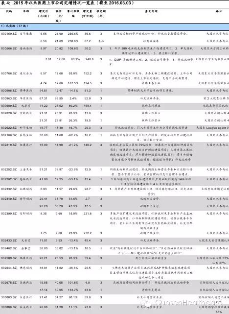 2015年至今共有79起医药上市公司完成实施定增,约占所有上市公司的1/3;证监会批准和发审委通过的有25起;股东大会通过和董事会预案的有57家。截至2016/03/03,绝大部分实施定增的公司股价相比增发价上涨,平均涨幅高达28.7%,其中涨幅至少为30%的公司有29家,占所有实施定增的公司的37.6%,涨幅在0-30%的公司有22家,占比为27.8%。从这里可以看出,在大势如此之差的情况下,仍然只有28家公司股价低于定增价之下。定增价格成为重要的股价支撑位。