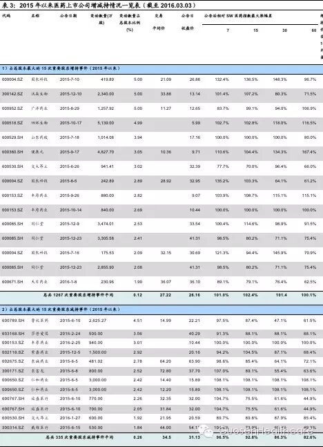 2015年6月市场大幅调整之后,国家队入市且鼓励公司股东增持本公司股票,并且设立了半年的持有时间下限,同时公司股东往往具有高抵押率,本身也有动力维持股价,因此2015年重要股东和关系人增持公司的次数明显增多。114家医药公司出现了增持本股票的现像,占整体医药公司数量超过一半。增减仓参考总市值最高达到43.5亿(同仁堂),单次增持占总股本最高的是国农科技、沃森生物、广济药业、四环生物,均达到了5%。但是以医药板块指数(市值加权)为基准,在7、15、30、60天时股价均值高于指数平均小于2%,说明在熊市中增持股份未必能支撑得住股价,板块呈现整体下跌趋势。