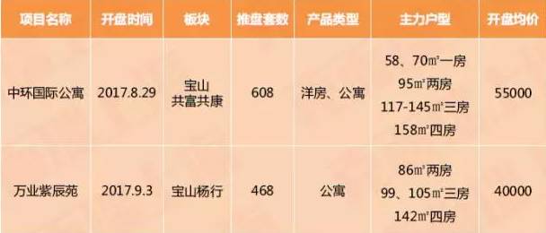 本周共2个项目开盘,中环国际公寓位于宝山共富共康板块,万业梦辰苑位于宝山杨行板块。