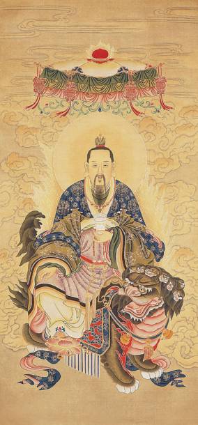:“东极青玄上帝太乙救苦天尊,骑九头狮子,化号十方救苦天尊,以度鬼魂。九头狮子吼声,能使地狱门开。”这里就把太乙救苦天尊的光耀形象生动地刻画了出来:或于坐九色莲花之上,或骑着九头狮子;手中拿着柳枝、净瓶或金剑,端庄威严,祥光闪闪。其手中所持的柳枝净水,是医治世人疾病的仙药符水。