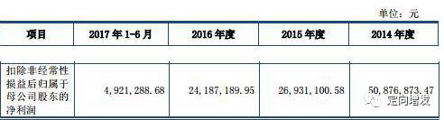 2014年至2017上半年,公司营业收入分别为5.17亿元、3.85亿元、3.55亿元和1.95亿元,扣非净利润分别为6244.38万元、3383.51万元、3201.89万元和4743.78万元,双双呈现下滑趋势。