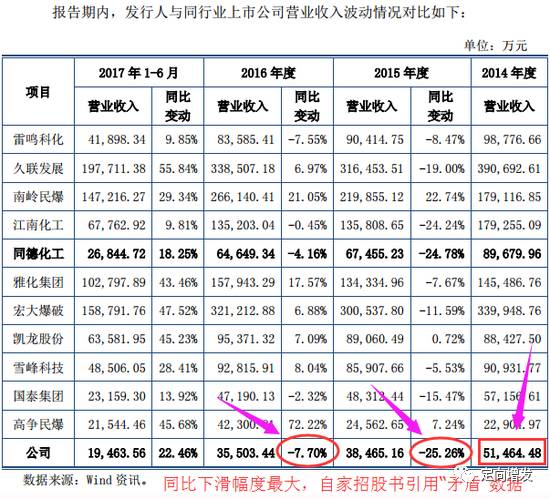 为进一步解释业绩下滑原因,壶化集团在招股书中,对同行业上市公司进行了对比。但和讯网发现,从列举的上市公司中,壶化集团的下滑速度依然是倒数第一名。值得注意的是,壶化集团提示数据来源于Wind,但公司2014的营收数据依然与最新披露不符。