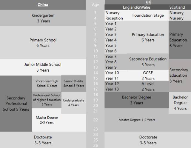 中国的教育体系就不多说了,大家都是过来人。而总体来说英国教育体系分为三个阶段:义务教育(Compulsory Education),延续教育(Further Education)和高等教育(Higher Education)。其中Year 1- Year 11属于义务教育,Year 12- Year 13属于延续教育,而之后都属于高等教育。