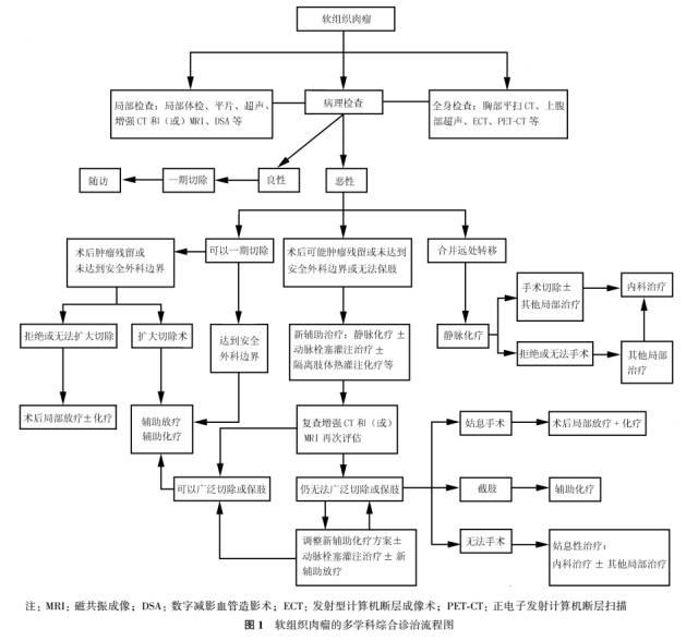 目前软组织肉瘤的诊治仍强调遵循多学科综合诊治原则,需要多学科综合诊治的主要是诊断疑难复杂或在治疗上各学科存在争议的软组织肉瘤患者,组织骨与软组织肉瘤外科、肿瘤内科、放疗科、影像科、病理科和介入治疗科等相关科室的专家进行讨论。根据患者的年龄、身体基本状况、病理类型和肿瘤侵犯范围等,认真阅片分析病情,依据最有利于患者疾病治疗和改善预后的原则,制订出有计划、按步骤地逐步实施的整体治疗方案,尽量让患者在治疗计划中获得最大的收益。但是对于已经获得R0切除、病理级别较低的Ⅰ级或部分Ⅱ级软组织肉瘤,术后予以定期随访或局部辅助放射治疗即可,无需所有病例均一成不变、刻板地进行多学科讨论。软组织肉瘤的多学科综合诊治流程见图1。