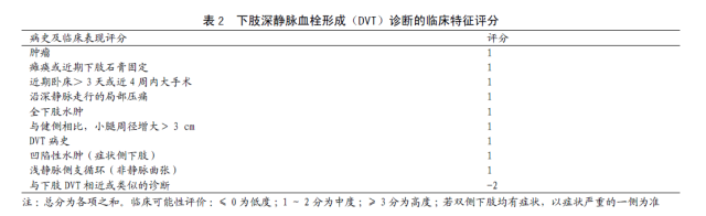 临床可能性评估和诊断流程 DVT 的临床可能性评估参考Wells 临床评分(表2),DVT 诊断流程见图1。