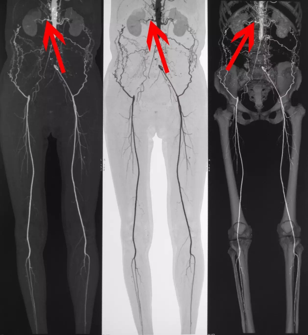 下一步病情评估总体分为两个方面,即动脉炎活动情况评估和全身血管(包括冠状动脉)病变程度的评估,以确定治疗的方向。进一步追问病史,患者出现脑供血不足和肢体缺血表现的2年后于外院诊断为“多发性大动脉炎”,曾口服激素治疗3年(具体用药不详),后因肝功能异常停药,治疗期间基本无发热及症状加重,其后长期服中药,病情也基本稳定,近期无明显发热、食欲不振、关节炎等表现。入院后检查ESR 30mm/h,CRP 0.93mmol/L,综合以上情况考虑多发性大动脉炎处于非活动状态。血管病变的评估方面,患者接受了CT血管造影检查,下肢血管造影结果为(如下图)腹主动脉下段及右侧髂总动脉闭塞,并大量侧枝循环形成;右侧肾动脉中至重度狭窄(箭头所指),左肾动脉轻度狭窄;腹腔干起始部中度狭窄,肠系膜上动脉起始部狭窄。上肢血管造影示双侧锁骨下动脉起始部管腔重度狭窄或闭塞,左侧椎动脉窃血;左侧颈总动脉起始部混合斑块,管腔狭窄40%,左侧颈内动脉闭塞;右侧颈总动脉管腔轻度狭窄;主动脉弓及降主动脉多发低密度斑块及混合斑块,管腔狭窄。