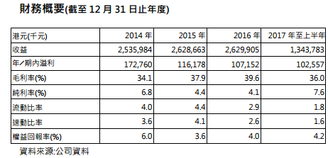 公告显示,于2014-2016年年度,该公司收入分别为25.36亿港元、26.29亿港元及26.3亿港元;公司拥有人应占溢利分别为1.49亿港元、1.01亿港元及9076.2万港元