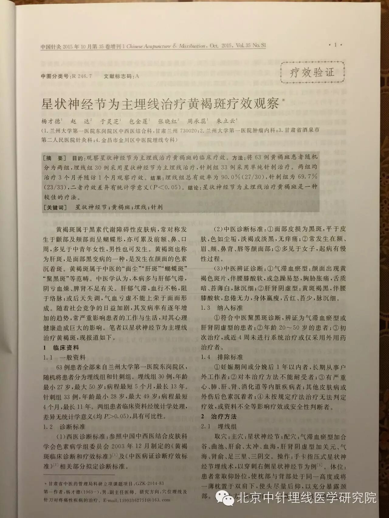 某女,35岁,于2014年9月8日就诊。病史:18岁颜面出现粉刺,未经治疗,至20岁病情加重,颜面布满大小不等结节,挤之有豆渣样物排出。同时伴有月经不调,心烦易怒。查:症见面部密布粉刺,除鼻及眼周外,其他部位均见散在黑头粉刺及米粒至豌豆大小结节隆起,红肿疼痛,尤以经期为甚,舌苔薄黄,脉滑数。诊断为痤疮。第一次治疗取穴:星状神经节,心俞,肝俞,血海,均双侧,2-0号PGLA线5cm,用手卡指压式星状神经节埋线术,获得针感后留线,2周1次。1次症状减半,2次症状消失,局部有色素沉着。第三次取穴:星状神经节,4次后面部光洁如新,月经规律,量中色正。