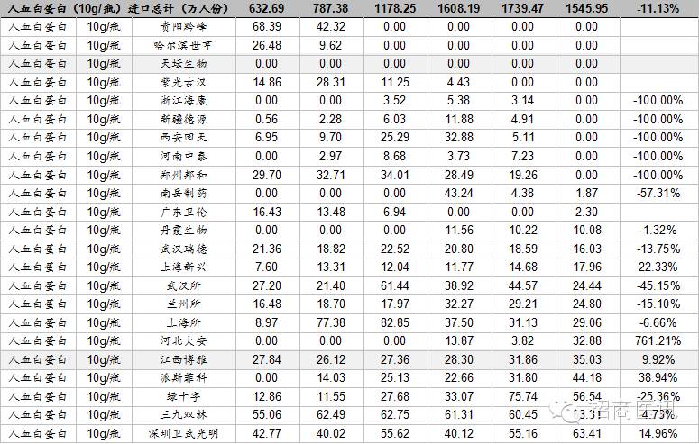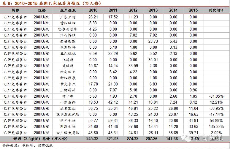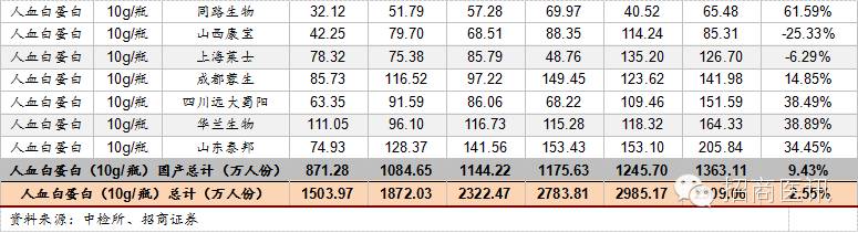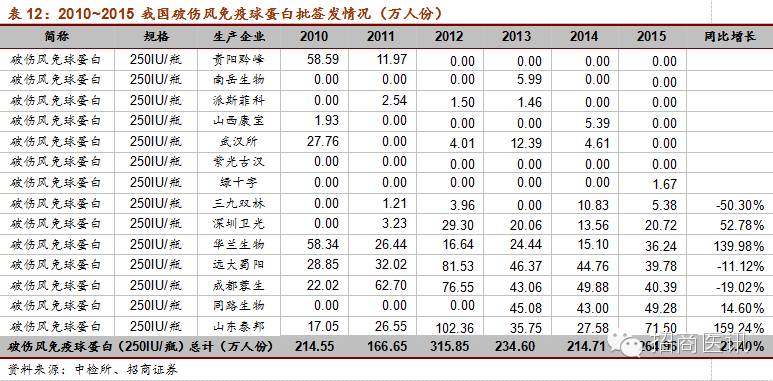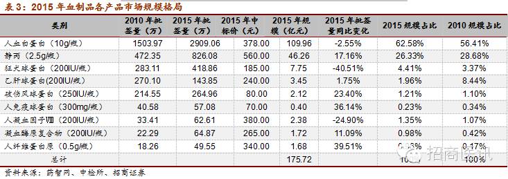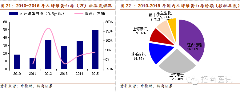 2015年共有19家企业有批签发记录,较2011年的24家少了5家,市场集中度有所上升。主要生产厂家有:山东泰邦(中国生物制品)、上海莱士(含同路生物)、成都蓉生、华兰生物、远大蜀阳、山西康宝、江西博雅等,2015年批签发量(折算成2.5g/瓶)分别为:161万、132万、95万、89万、82万、41.3万、72万和22万瓶,占比约80%。山东泰邦、上海莱士和四川远大蜀阳增速靠前,分别为54.65%、59.43%和68.59%。