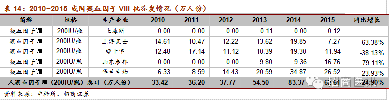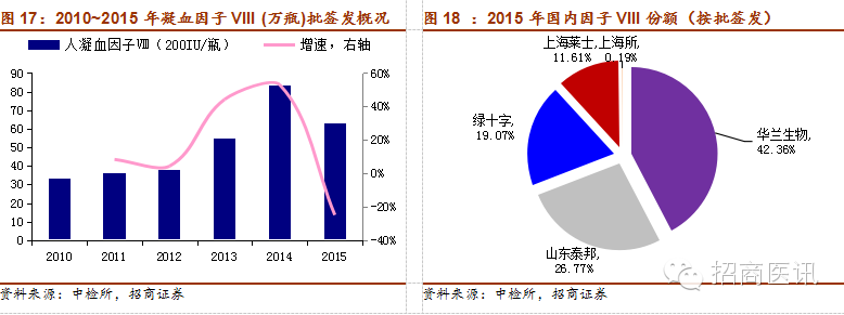 2011-2014年凝血因子VIII批签发迅速上升,CAGR为25.67%,2014年批签量为83.37万瓶。2015年批签量为62.61万瓶,同比下降24.90%,未能延续高增长态势。 2015年国内共有5家企业获得凝血因子VIII批签发:华兰生物、山东泰邦、绿十字、上海莱士和上海所。其中华兰生物占比42.36%,占主导地位;2011年占比43.71%的上海莱式2015年占比只有11.61%。
