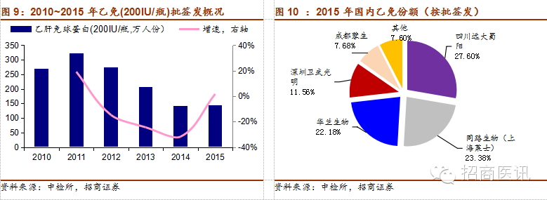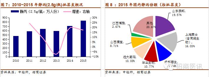 受新版GMP改造的影响,2013年国内静丙生产出现下滑。在2013年末GMP改造及认证完成后,国内各生产厂家静丙产量逐渐回升,2014和2015年批签量增速均超15%。