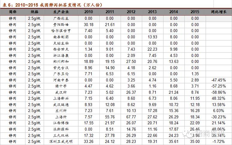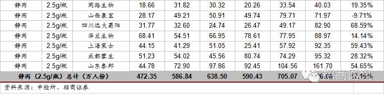 2015年,国内共有9家企业批签发,其中三九双林和山东邦泰占比分别为30.23%和19.35,合计约50%。武汉所和四川远大蜀阳两家占比在10%-15%之间,前四家占比约75%,市场集中度高。前5家生产企业2015年批签量下降都在20%以上。
