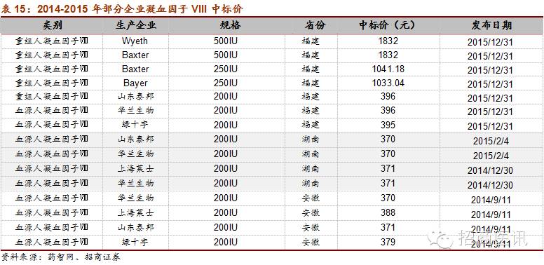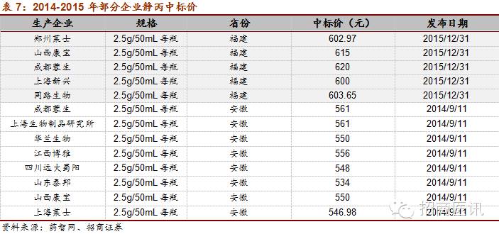 由于血制品供不应求,静丙价格提升明显。根据博雅生物招股说明,2008年、2009年和2010年博雅生物静丙(2.5g)平均销售价格分别为212.62元/瓶、261.30元/瓶和421.77元/瓶。据2014年9月安徽招标数据,博雅生物静丙(2.5g)中标价为556元,表明2011-2015年静丙价格继续提升,15年年底静丙(2.5g)中标价普遍超过600元。