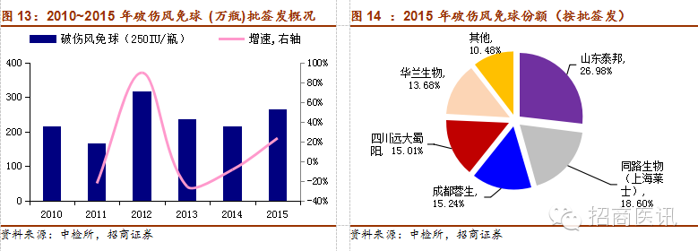 2015年批签量264.96万瓶,同比上升23.40%。山东邦泰和华兰生物2015年批签量分别同比上升159.24%和139.38%,占批签发比例分别为26.98%和13.68%。同路生物、成都蓉生和远大蜀阳2015年批签发占比都在15%-20%范围内。同路生物自2013年获得批签发以来占比一直在20%左右。成都蓉生和远大蜀阳2015年同比下降19.02%和11.12%。