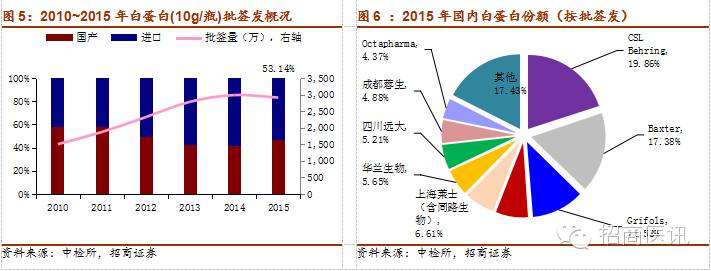 2015年国产人血白蛋白批签量1363.11万瓶,同比增加9.43%。2015年国内有白蛋白批签发的血制品企业共21家,批签量为1363.11万瓶(折算成10g/瓶),同比上升9.43%。人血白蛋白主要生产厂家有山东泰邦(中国生物制品)、上海莱士(含同路生物)、华兰生物、远大蜀阳、成都蓉生等,批签发量分别为205万、192万、164万、151万、141万瓶,其中山东泰邦(中国生物制品)、华兰生物、远大蜀阳批签量增速都在34%-39%之间,实现了高增长。A股上市公司中,批签量从高到低分别为华兰生物(164.33万瓶,+38.89%)、上海莱士(不含同路生物为126.70万瓶,-6.29%;含同路生物为192.18万瓶,+9.36%)、江西博雅(35.03万瓶,+9.92%)。