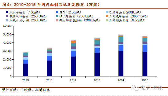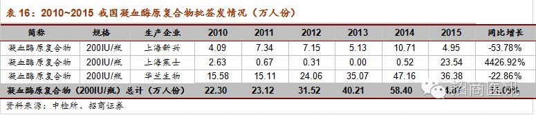 人纤维蛋白原在经过了2013年GMP改造影响后保持了高增长的态势,2015年批签发为49.55万瓶,同比上升39.51%。