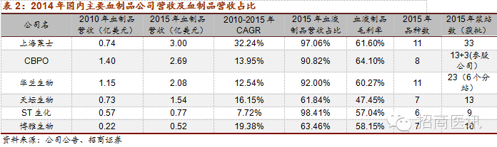 并购扩张带来快速增长,上海莱士市场份额超CBPO成为第一。受益于并购扩张,上海莱士(并购同路生物、郑州莱士)和天坛生物(并购成都蓉生)2010-2015年的血制品营收CARG在营收超过10亿人民币的公司中位列前茅,处于快速增长的状态。其中上海莱士2010-2015年血制品营收CARG达到了32.24%,2015年血制品营收上升52.49%,市场份额首次超越CBPO成为国内第一。上市公司中还有博雅生物由于业务体量比较小,保持了约20%的年增速。2011年贵州16家浆站的关停对中国生物制品有限公司(CBPO,泰邦生物)和华兰生物的影响比较大,导致两家公司的血制品营收CAGR都没有达到15%。从浆站的数量上看,上海莱士以33家遥遥领先,在采浆量处于短缺的国内具有明显优势。