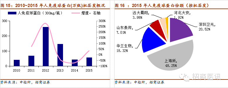 人免疫球蛋白在2012年的爆发后批签量开始下降,2015年批签量为57.08万瓶,同比上升36.14%,止住了下降的脚步。