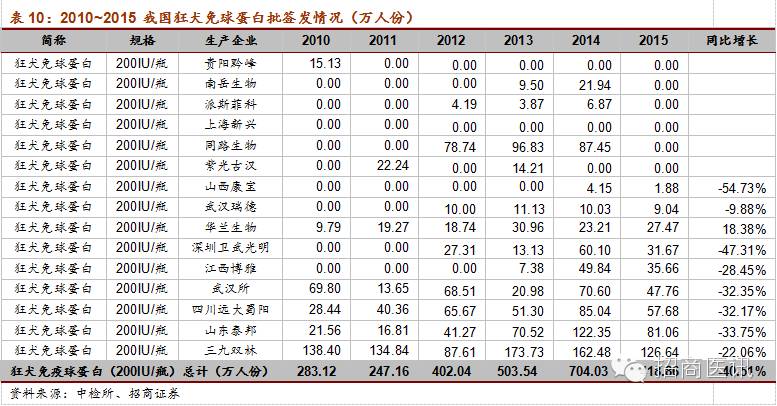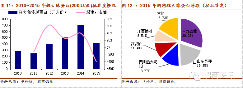 2011年-2014年国内狂犬球蛋白批签量快速增长,CAGR25.57%,2014年批签量达704.03万瓶。随着国内加强宠物、流浪猫狗管理,再加上狂犬疫苗的冲击,狂犬球蛋白需求出现下滑,批签量回调。2015年批签量418.86万瓶,同比下降40.51%。