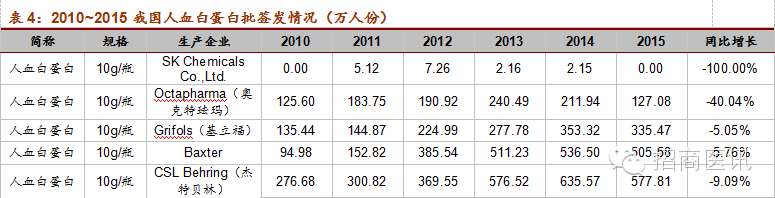 2010-2014年,进口人血白蛋白批签量稳定增加,CAGR为28.76%,同期总批签量CAGR为18.69%。进口产品在总批签量中的比例不断上升,从2010年的42.07%上升到了2014年的58.27%。2015年人血白蛋白总批签量为2909.06万瓶(10g/瓶),同比下降2.55%;进口产品批签量为1545.95万瓶,增速-11.13%,占比53.14%,5年内首次出现下降。全球血制品三大巨头CSL Behring、Baxter和Grifols批签量下降幅度都在5%-10%之间,Octapharma 2015年批签量127.08万瓶,同比大幅下降40.01%。
