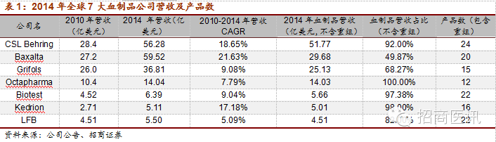 Baxalta 2015年7月从Baxter分离出来独立运作,作为全球最大的重组凝血因子生厂商,其重组凝血因子2014年营收占整体收入的近50%;剩余的50%来自血制品。此外Baxalta还拥有抗肿瘤药的研发和销售,但当前营收占比可以忽略不计。Grifols是7大生产商中“副业”比较多的,除了血制品和重组的凝血因子外,Grifols还拥有诊断和医院业务,两者合计占营收的30%左右。
