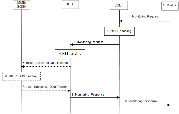 SCEF会将监测事件请求(Monitoring Request)继续下发HSS,如果HSS被要求特定的监测类型(例如 "Reachabilityfor SMS", 或者"Reachability forData", 或者两者都配置)并且服务MME/SGSN也同样支持该特定的监测事件,那么下发Insert Subscriber Data Request(作用等同于Monitoring Request)。如果特定的监测类型是"Reachabilityfor SMS",那么监测流程仅支持“一次性”(One-time)的Monitoring Request下发反馈机制。
