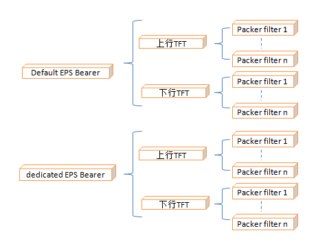 一个PDN连接可以包含多个EPS bear,其中包含至少一个默认承载(default EPS bear)和若干专属承载(dedicated EPS bear)。一个EPS bear是基于QoS建立的逻辑概念,是对一系列数据集的QoS进行归类标识的基本单位。因此,EPS Bearer本身没有上下行Bear之分。不过,一个EPS bear可以分别对应上行TFT( traffic flow template)和下行TFT。一个TFT又可以包含若干packet filter(s),而这些packer filter通过自身优先级标签(precedence index)的机制分别将上下行的数据包封装映射进不同的EPS bear。