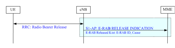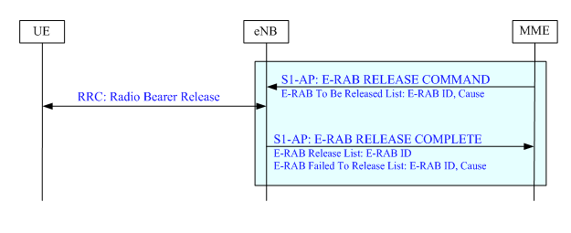 E-RAB释放既可以由MME发起,也可以由eNodeB发起。MME发起的释放指令中包含 E-RAB To Be Released List ,这是要被释放的E-RAB。eNodeB接收到指令后,不仅需要把列表中的E-RAB释放掉,同时通过空口(Uu)把对应的DRB以及分配资源释放掉,并将S1的分配资源释放掉,同时对于释放掉的E-RAB情况通过Response指令反馈给MME。