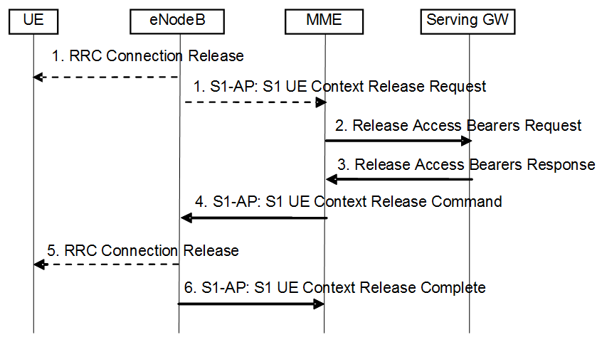 eMTC/NB/LTE中,用户上下文释放既可以由eNodeB发起也可以由MME发起。这一释放流程不仅释放S1-AP信令连接(S1-MME),同时也释放S1-U承载。而对于eMTC/NB中的CP优化模式,这一流程之间释放了S11-U承载。由于某些特殊的原因,例如S1信令传输丢失或者eNodeB/MME某个网元的问题,用户上下文可以在某个网元进行本地释放,这样就不需要使用或者依靠如下图网元之间的信令流程了。