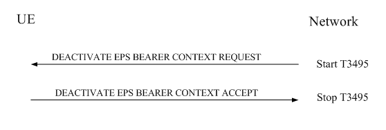 除此之外,EPS承载去激活还可以由UE发起的承载资源修改流程或者UE要求的PDN连接释放流程触发,如果是这两种原因,EPS承载去激活请求必须携带分别来自BEARER RESOURCE MODIFICATION REQUEST或者 PDN DISCONNECT REQUEST的流程交易标识PTI(procedure transaction identity)
