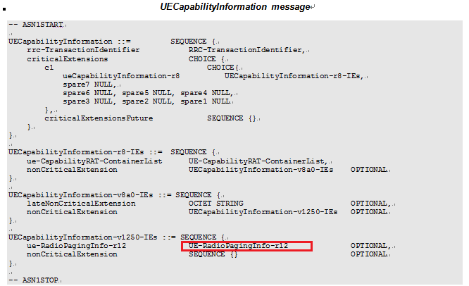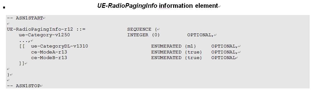 BL UEs与UE in CE的寻呼机制是一样的,寻呼的其实时刻,重复周期与覆盖等级无关。不过,UE在能力上报中可以上报ue-RadioPagingInfo,包括UE的类型以及相应可支持的增强覆盖等级。
