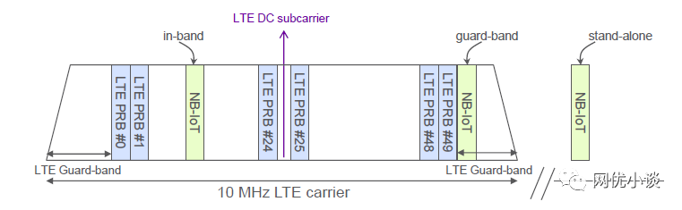 由于零中频接收的问题,NB-IoT采取独立模式部署和带内部署与保护带模式的OFDM符号的频偏是不一样的,独立模式下采取频偏7.5kHz的方式在零中频接收机下进行平衡。而带内模式或者保护带模式则严格与LTE子载波保持正交,同时基于LTE系统的中心子载波进行了一定的错位。这种错位UE事先不得而知,主要取决于网络侧的配置。这样的配置需要考虑两方面的因素,其一不能与LTE系统的PSS/SSS冲突,这意味着不能配置在中间6个PRB,另外一方面需要考虑是否能够被UE开机搜索到。