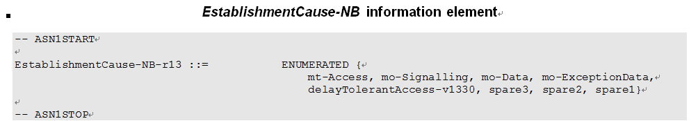 mo-ExceptionData:针对NB的主叫信令发起,如果小区访问禁止,而UE允许使用接入异常事件标签,那么对于Attach/TAU/Service request可以继续发送,而RRC接入标签则可设置为mo-ExceptionData原因值。