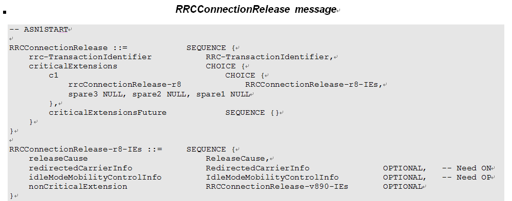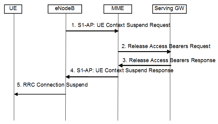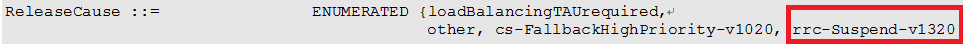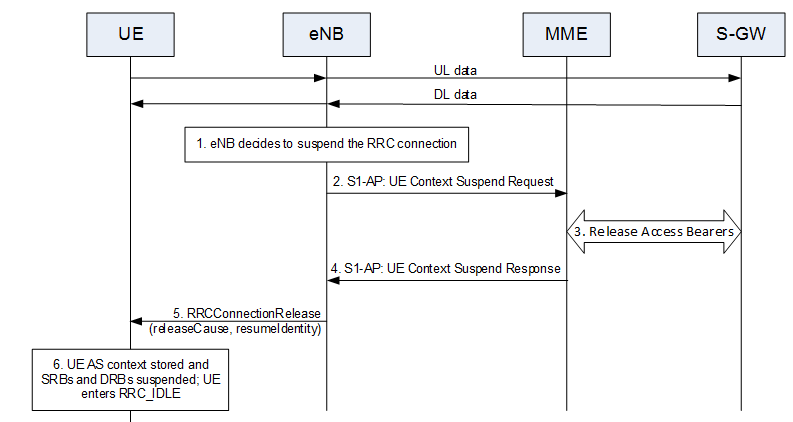 网络侧通过RRCConnectionRelease封装Suspend消息通知UE挂起,当RRC连接被挂起后,UE存储UE AS上下文和resumeIdentity,同时变为RRC_IDLE状态。挂起针对已建立的用户面承载,所以在至少一个DRB成功建立之后,挂起流程才能够执行。